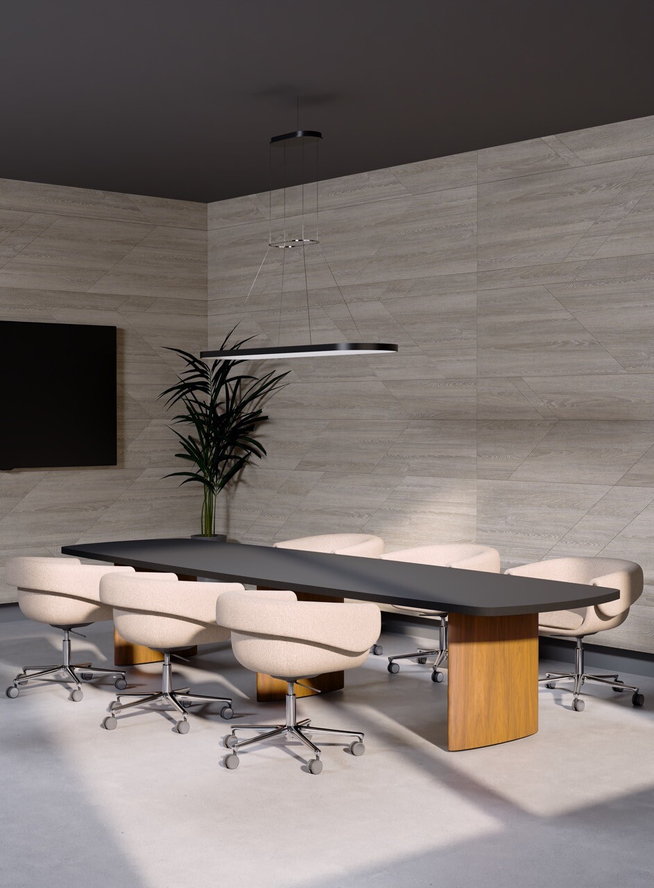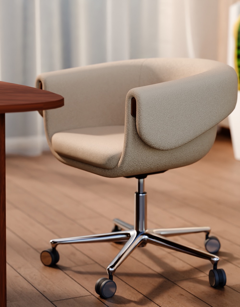 The Monica Conference is a soft lounge chair featuring a wheeled base and a 'draped' upholstered soft shell resting on it. The duality of the chair is based on contrasts between hard and soft, static and fluid. The organic, soft shape provides a luxury comfort to the user. A new addition to the Monica collection, this model is specially designed for your conference desk.